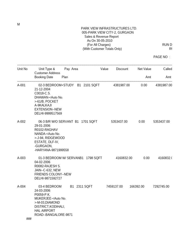 Unit No Unit Type & Pay Area Value Discount Net Value Called R