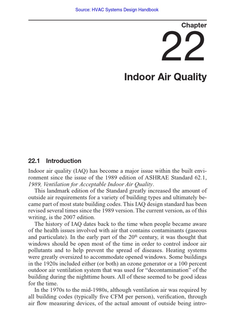 22.1 Introduction Indoor air quality (IAQ) has become a major issue within the built environment since the issue of the 1989 edition of ASHRAE Standard 62.1, 1989, Ventilation for Acceptable Indoor Air Quality. This landmark edition of the Standard greatly increased the amount of outside air requirements for a variety of building types and ultimately became part of most state building codes. This IAQ design standard has been revised several times since the 1989 version. The current version, as of this writing, is the 2007 edition. The history of IAQ dates back to the time when people became aware of the health issues involved with air that contains contaminants (gaseous and particulate). In the early part of the 20th century, it was thought that windows should be open most of the time in order to control indoor air pollutants and to help prevent the spread of diseases. Heating systems were greatly oversized to accommodate opened windows. Some buildings in the 1920s included either (or both) an ozone generator or a 100 percent outdoor air ventilation system that was used for decontamination of the building during the nighttime hours. All of these seemed to be good ideas for the time. In the 1970s to the mid-1980s, although ventilation air was required by all building codes (typically ve CFM per person), verication, through air ow measuring devices, of the actual amount of outside being intro-