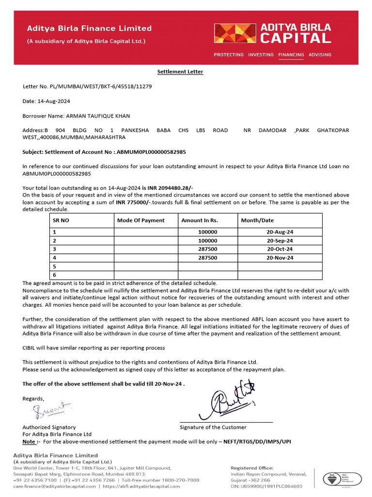 In reference to our continued discussions for your loan outstanding amount in respect to your Aditya Birla Finance Ltd Loan no