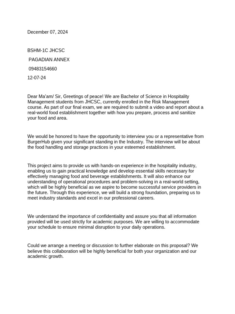 Dear Ma’am/ Sir, Greetings of peace! We are Bachelor of Science in Hospitality
