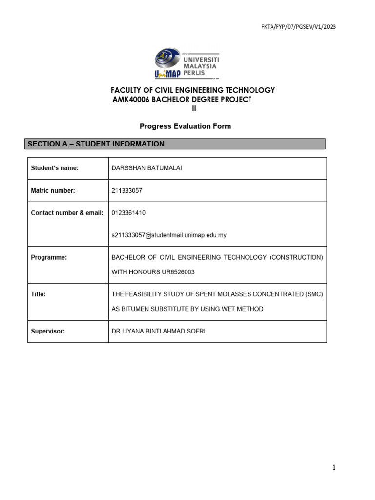 SECTION B – EVALUATION OF RESEARCH PROGRESS BY STUDENT
