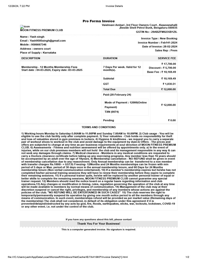 Membership - 12 Months Membership Fees 7 Days Per week. Valid for 12 Discount : ₹ 5,700.00
