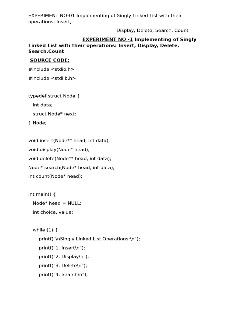EXPERIMENT NO-01 Implementing of Singly Linked List with their