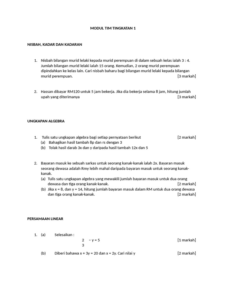 1. Nisbah bilangan murid lelaki kepada murid perempuan di dalam sebuah kelas ialah 3 : 4.