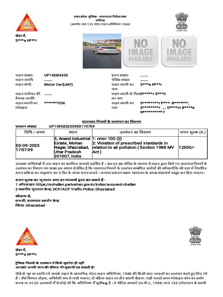 उपलब्ध अभिलेखों में उक्त वाहन का स्वामित्व आपको प्रदर्शित है । अत:एव इस नोटिस के माध्यम से वाहन द्वारा किये गए यातायात नियमों के