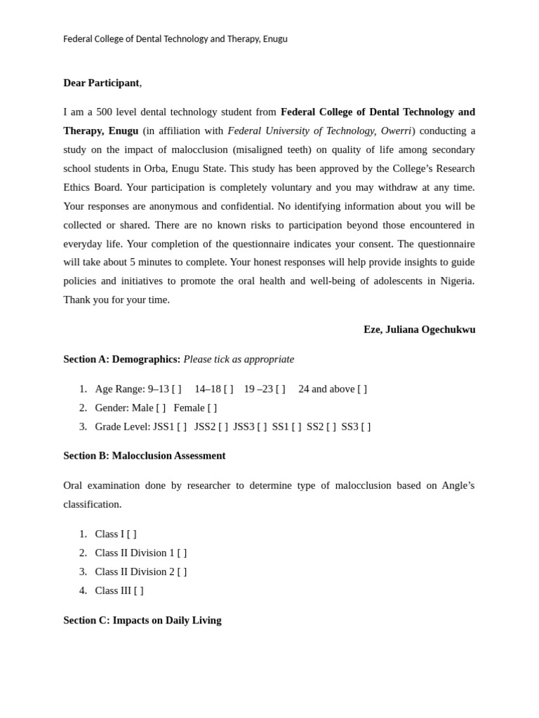 school students in Orba, Enugu State. This study has been approved by the College’s Research
