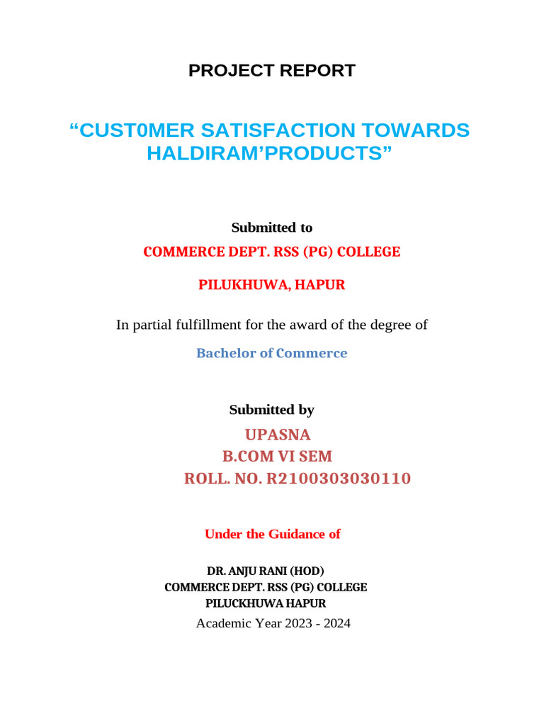 SATISFACTION TOWARDS HALDIRAM’PRODUCTS” towards partial fulfillment of