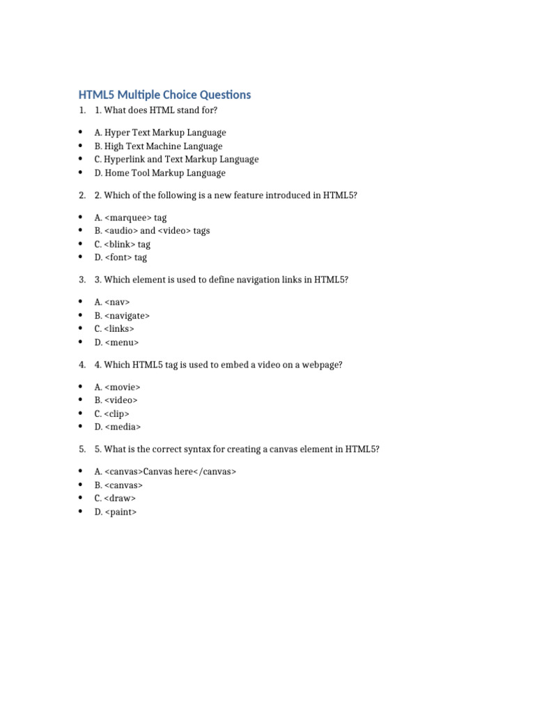 HTML5 Multiple Choice Questions