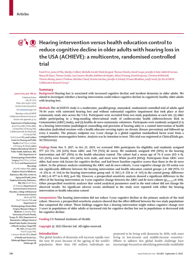 Lancet 2023; 402: 786–97 Background Hearing loss is associated with increased cognitive decline and incident dementia in older adults. We