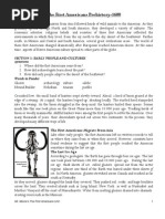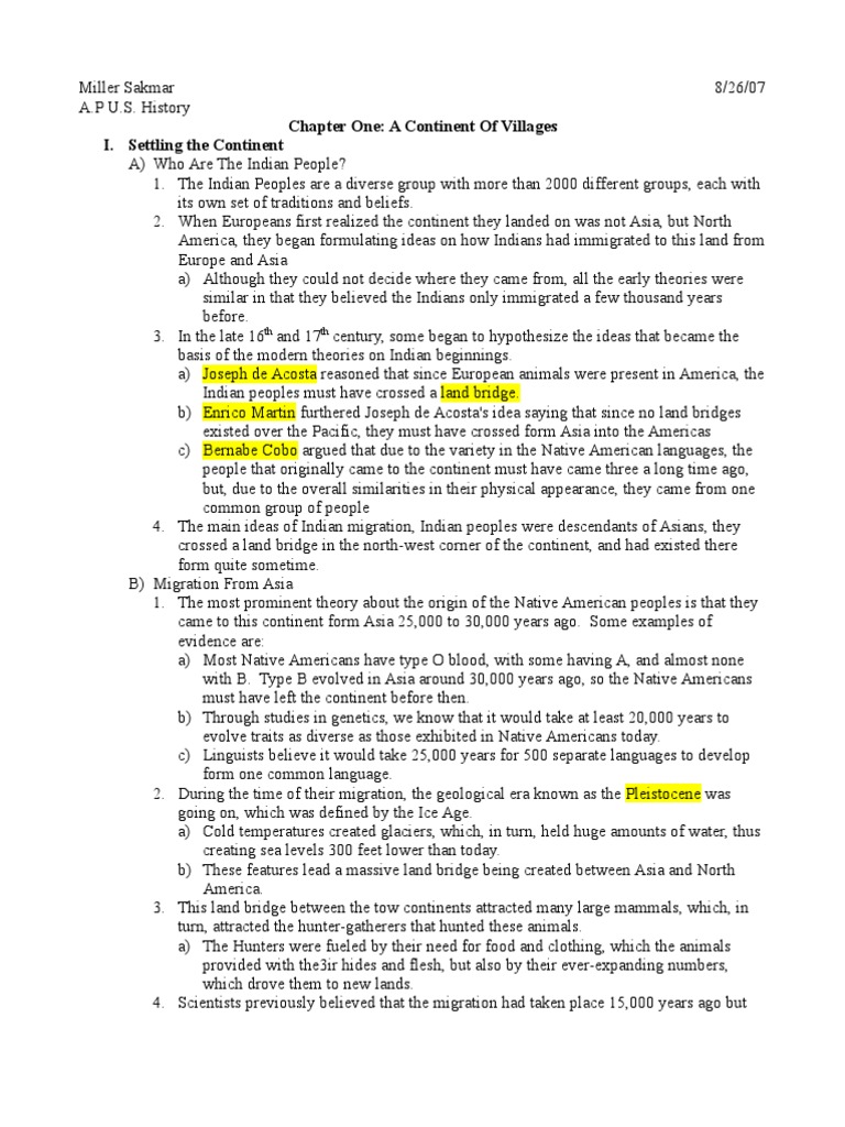 I. Settling the Continent A) Who Are The Indian People? 1. The Indian Peoples are a diverse group with more than 2000 different groups, each with its own set of traditions and beliefs. 2. When Europeans first realized the continent they landed on was not Asia, but North America, they began formulating ideas on how Indians had immigrated to this land from Europe and Asia a) Although they could not decide where they came from, all the early theories were similar in that they believed the Indians only immigrated a few thousand years before. 3. In the late 16th and 17th century, some began to hypothesize the ideas that became the basis of the modern theories on Indian beginnings. a) Joseph de Acosta reasoned that since European animals were present in America, the Indian peoples must have crossed a land bridge. b) Enrico Martin furthered Joseph de Acosta's idea saying that since no land bridges existed over the Pacific, they must have crossed form Asia into the Americas c) Bernabe Cobo argued that due to the variety in the Native American languages, the people that originally came to the continent must have came three a long time ago, but, due to the overall similarities in their physical appearance, they came from one common group of people 4. The main ideas of Indian migration, Indian peoples were descendants of Asians, they crossed a land bridge in the north-west corner of the continent, and had existed there form quite sometime. B) Migration From Asia 1. The most prominent theory about the origin of the Native American peoples is that they came to this continent form Asia 25,000 to 30,000 years ago. Some examples of evidence are: a) Most Native Americans have type O blood, with some having A, and almost none with B. Type B evolved in Asia around 30,000 years ago, so the Native Americans must have left the continent before then. b) Through studies in genetics, we know that it would take at least 20,000 years to evolve traits as diverse as those exhibited in Native Americans today. c) Linguists believe it would take 25,000 years for 500 separate languages to develop form one common language. 2. During the time of their migration, the geological era known as the Pleistocene was going on, which was defined by the Ice Age. a) Cold temperatures created glaciers, which, in turn, held huge amounts of water, thus creating sea levels 300 feet lower than today. b) These features lead a massive land bridge being created between Asia and North America. 3. This land bridge between the tow continents attracted many large mammals, which, in turn, attracted the hunter-gatherers that hunted these animals. a) The Hunters were fueled by their need for food and clothing, which the animals provided with the3ir hides and flesh, but also by their ever-expanding numbers, which drove them to new lands. 4. Scientists previously believed that the migration had taken place 15,000 years ago but