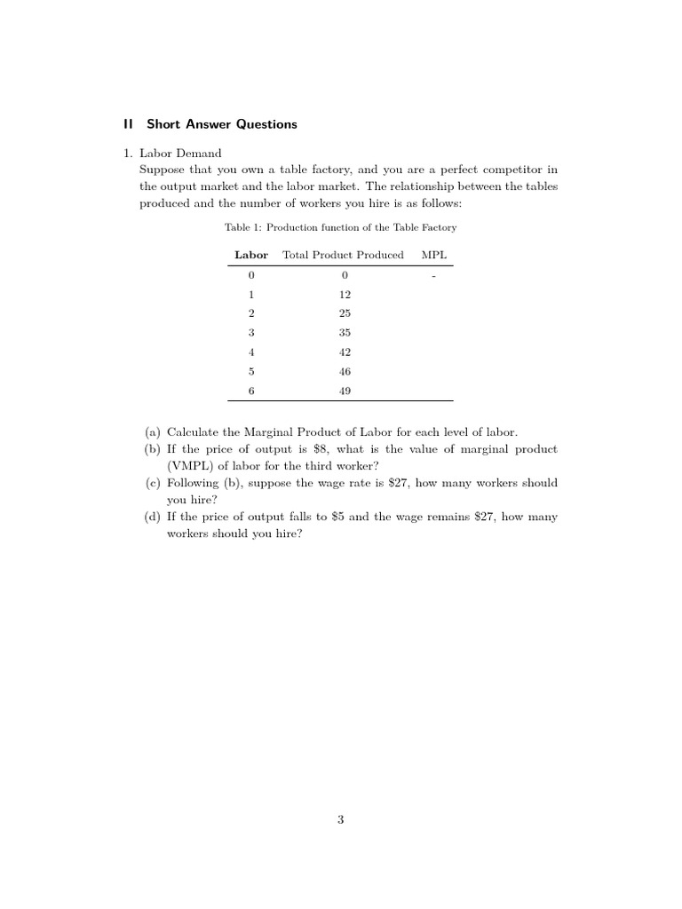 (a) Calculate the Marginal Product of Labor for each level of labor.