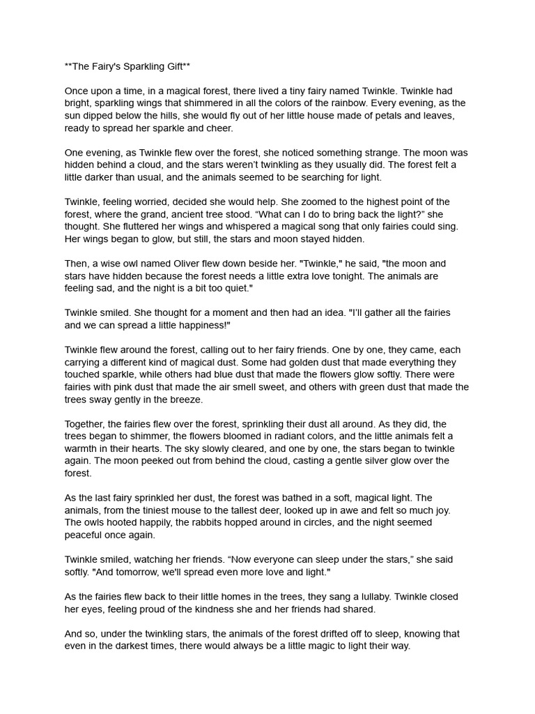 Once upon a time, in a magical forest, there lived a tiny fairy named Twinkle. Twinkle had