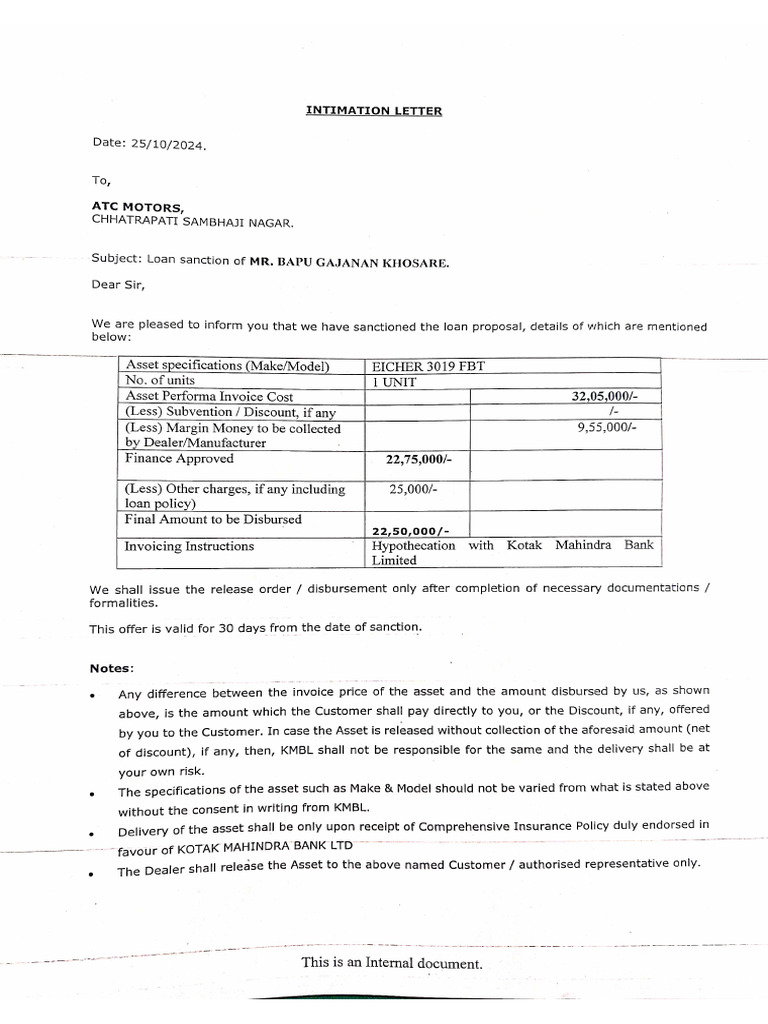 We are pleased to inform you that we have sanctioned the loan proposal, details of which are mentioned