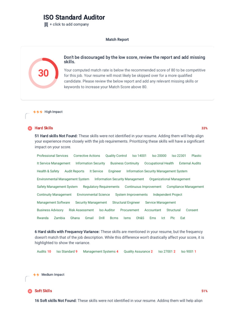 51 Hard skills Not Found: These skills were not identified in your resume. Adding them will help align