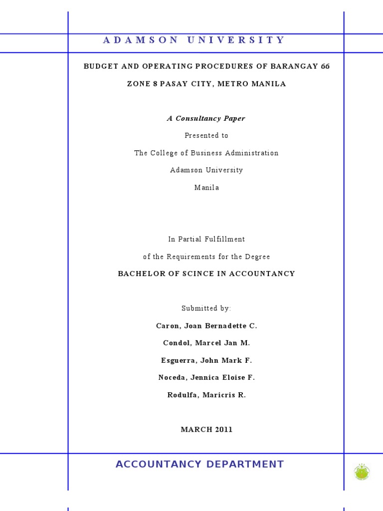 and the Barangay Chairman is held primarily responsible for its execution of and accountability. This study of the operations of a barangay aims to provide a better understanding to the community of the said barangay regarding the utilization of financial resources of their barangay. This study will also give them awareness and eventually help their barangay in its functions and operations. In this study, the researchers gained knowledge of how a barangay, the smallest unit of the local government, conduct its operations and handle their financial resources efficiently for the whole year in a manner that will benefit the whole community. The future researchers can also make use of this study as a basis or reference for further investigation and analysis of the subject or situation.