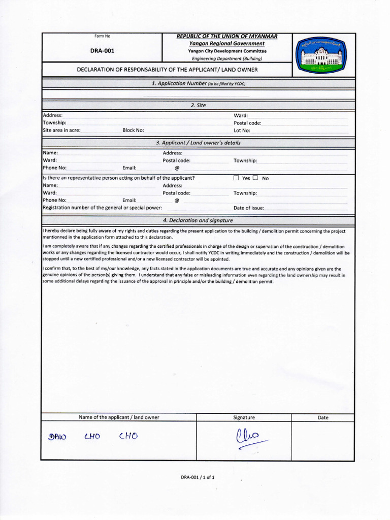 DECLARATION OF RESPONSABILITY OF THE APPLICANT/ LAND OWNER