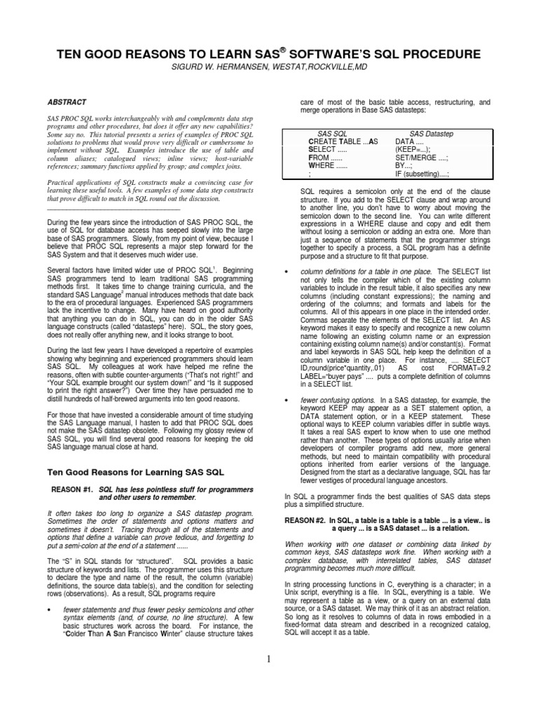 SAS PROC SQL works interchangeably with and complements data step programs and other procedures, but does it offer any new capabilities? Some say no. This tutorial presents a series of examples of PROC SQL solutions to problems that would prove very difficult or cumbersome to implement without SQL. Examples introduce the use of table and column aliases; catalogued views; inline views; host-variable references; summary functions applied by group; and complex joins. Practical applications of SQL constructs make a convincing case for learning these useful tools. A few examples of some data step constructs that prove difficult to match in SQL round out the discussion. ___________________________________ During the few years since the introduction of SAS PROC SQL, the use of SQL for database access has seeped slowly into the large base of SAS programmers. Slowly, from my point of view, because I believe that PROC SQL represents a major step forward for the SAS System and that it deserves much wider use. Several factors have limited wider use of PROC SQL . Beginning SAS programmers tend to learn traditional SAS programming methods first. It takes time to change training curricula, and the 2 standard SAS Language manual introduces methods that date back to the era of procedural languages. Experienced SAS programmers lack the incentive to change. Many have heard on good authority that anything you can do in SQL, you can do in the older SAS language constructs (called datasteps here). SQL, the story goes, does not really offer anything new, and it looks strange to boot. During the last few years I have developed a repertoire of examples showing why beginning and experienced programmers should learn SAS SQL. My colleagues at work have helped me refine the reasons, often with subtle counter-arguments (Thats not right! and Your SQL example brought our system down! and Is it supposed to print the right answer?) Over time they have persuaded me to distill hundreds of half-brewed arguments into ten good reasons. For those that have invested a considerable amount of time studying the SAS Language manual, I hasten to add that PROC SQL does not make the SAS datastep obsolete. Following my glossy review of SAS SQL, you will find several good reasons for keeping the old SAS language manual close at hand.