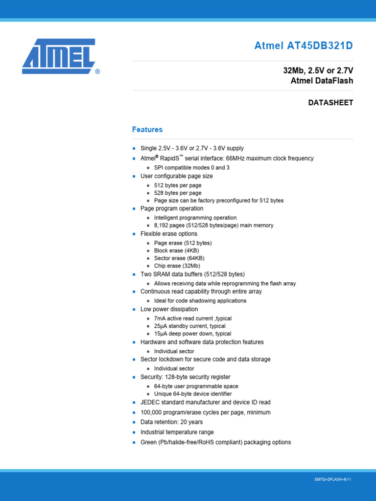 The Atmel AT45DB321D is a 2.5V or 2.7V, serial interface, sequential access flash memory ideally suited for a wide variety of