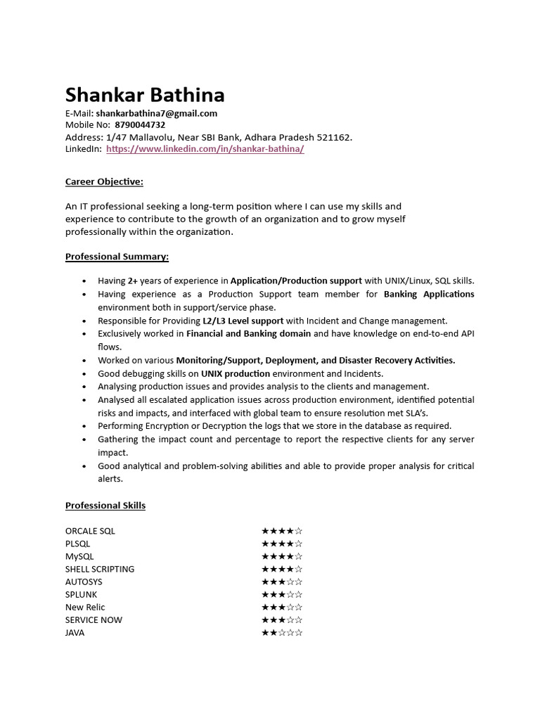 • Having 2+ years of experience in Application/Production support with UNIX/Linux, SQL skills.