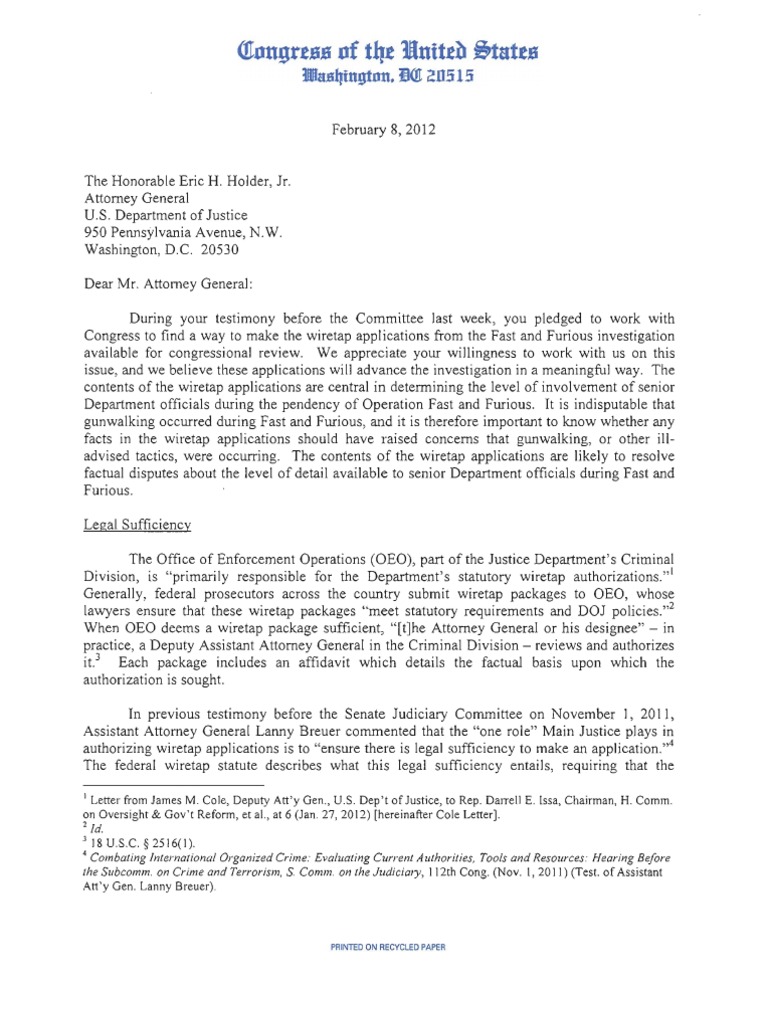 Letter from Reps. Darrell Issa and Patrick Meehan, and Sen. Chuck Grassley to Attorney General Eric Holder on releasing wiretap documents related to the congressional Fast and Furious gunwalking investigation.