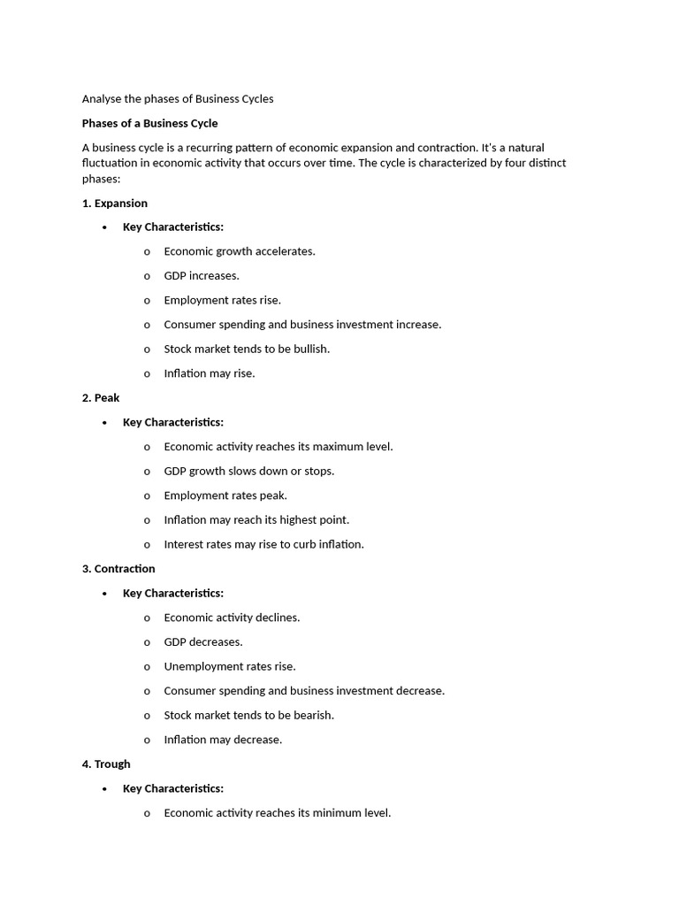 fluctuation in economic activity that occurs over time. The cycle is characterized by four distinct