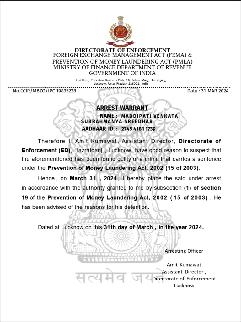 No.ECIR/MBZO/IPC 19835228 Date : 31 MAR 2024