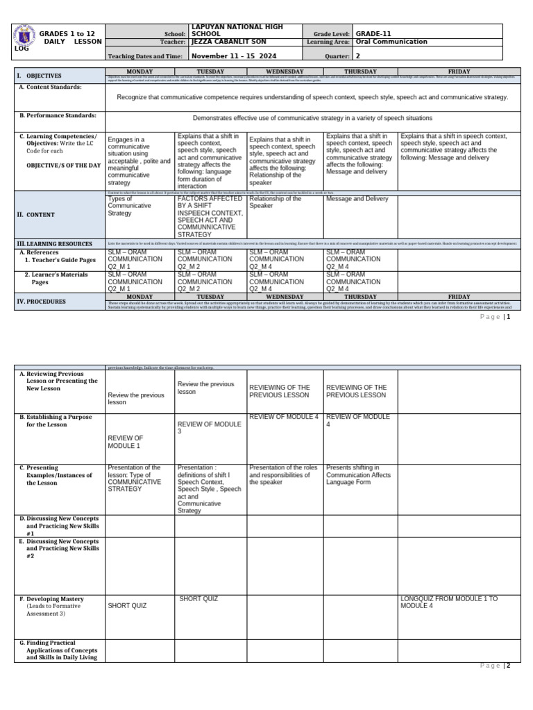 DAILY LESSON Teacher: JEZZA CABANLIT SON Learning Area: Oral Communication