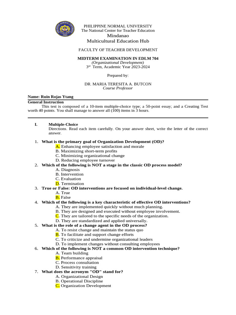 This test is composed of a 10-item multiple-choice type; a 50-point essay; and a Creating Test
