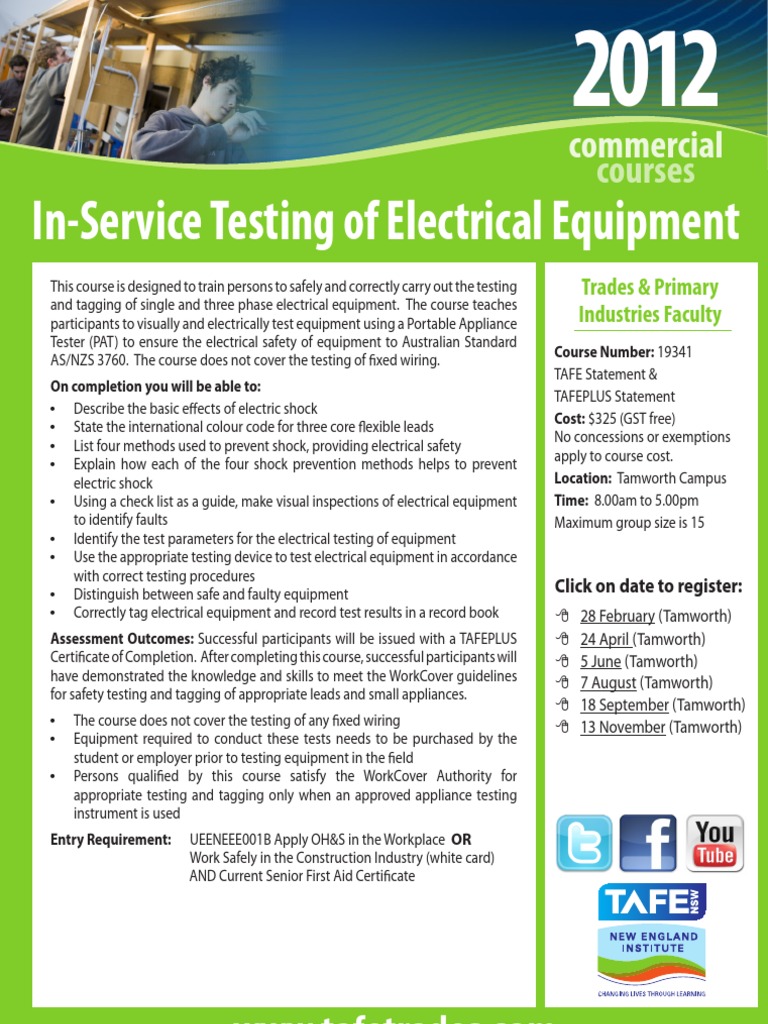 This course is designed to train persons to safely and correctly carry out the testing and tagging of single and three phase electrical equipment. The course teaches participants to visually and electrically test equipment using a Portable Appliance Tester (PAT) to ensure the electrical safety of equipment to Australian Standard AS/NZS 3760. The course does not cover the testing of fixed wiring. On completion you will be able to: Describe the basic effects of electric shock State the international colour code for three core flexible leads List four methods used to prevent shock, providing electrical safety Explain how each of the four shock prevention methods helps to prevent electric shock Using a check list as a guide, make visual inspections of electrical equipment to identify faults Identify the test parameters for the electrical testing of equipment Use the appropriate testing device to test electrical equipment in accordance with correct testing procedures Distinguish between safe and faulty equipment Correctly tag electrical equipment and record test results in a record book Assessment Outcomes: Successful participants will be issued with a TAFEPLUS Certificate of Completion. After completing this course, successful participants will have demonstrated the knowledge and skills to meet the WorkCover guidelines for safety testing and tagging of appropriate leads and small appliances. The course does not cover the testing of any fixed wiring Equipment required to conduct these tests needs to be purchased by the student or employer prior to testing equipment in the field Persons qualified by this course satisfy the WorkCover Authority for appropriate testing and tagging only when an approved appliance testing instrument is used Entry Requirement: UEENEEE001B Apply OH&S in the Workplace OR Work Safely in the Construction Industry (white card) AND Current Senior First Aid Certificate