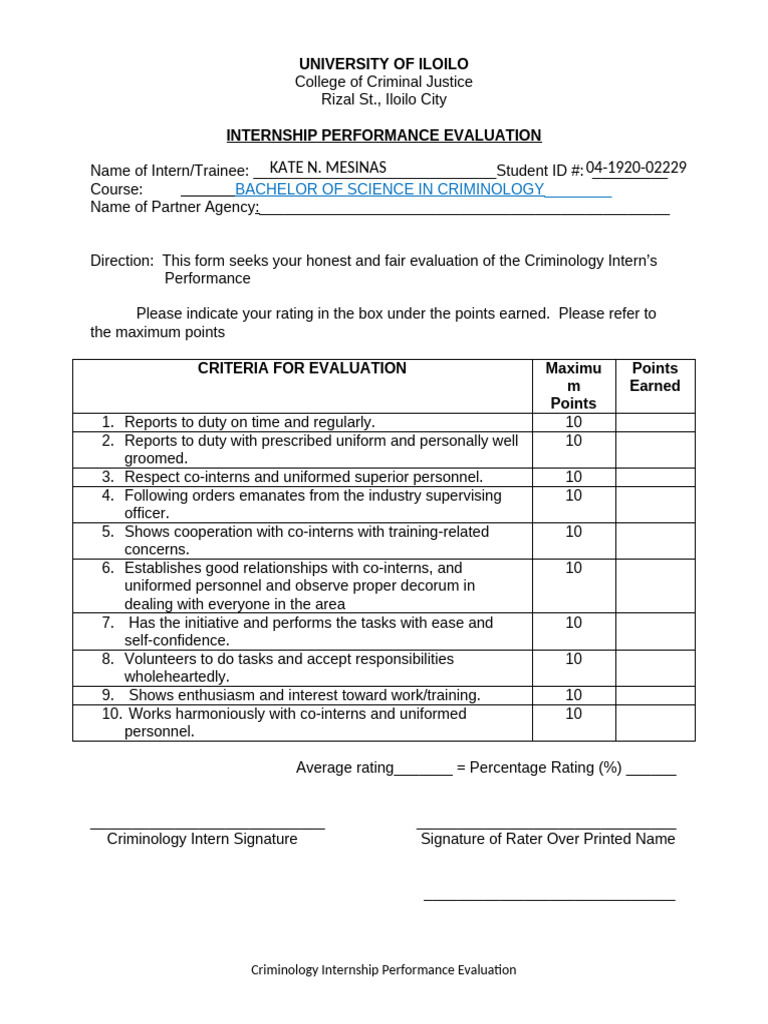 Direction: This form seeks your honest and fair evaluation of the Criminology Intern’s