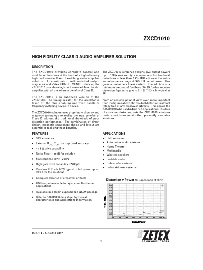 ZXCD1010 provides a high performance Class D audio minimum amount of feedback (10dB) further reduces