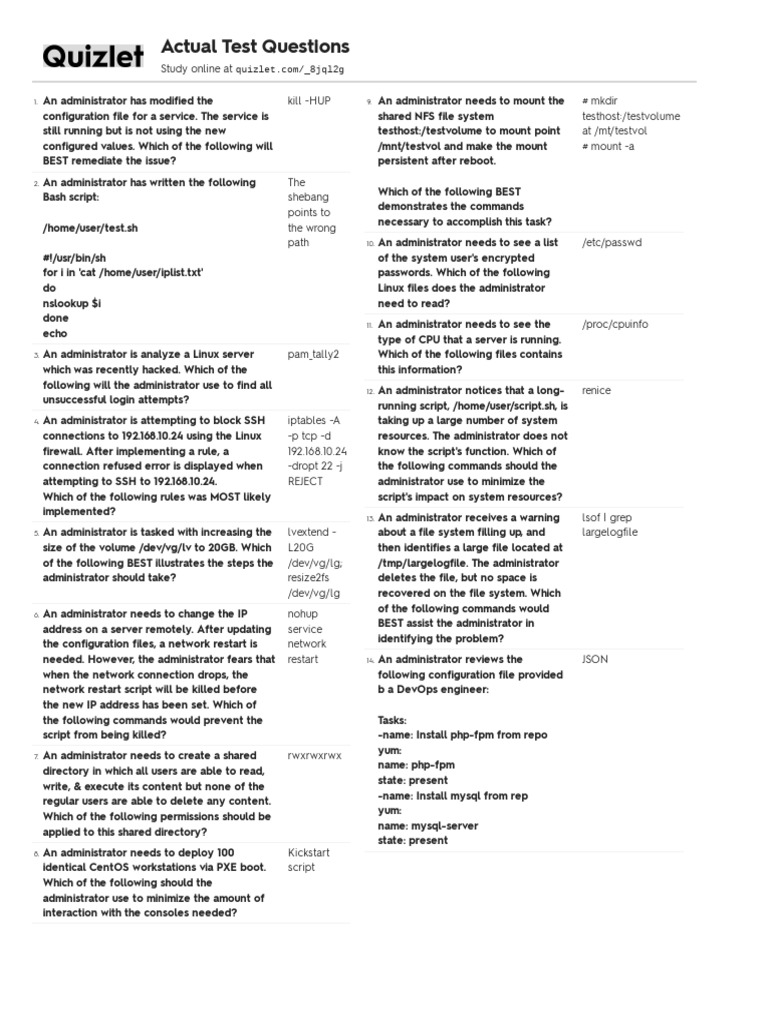 49. A Linux administrator has echo "1" > 52. A Linux administrator is confirming information cat /etc/resolv.conf