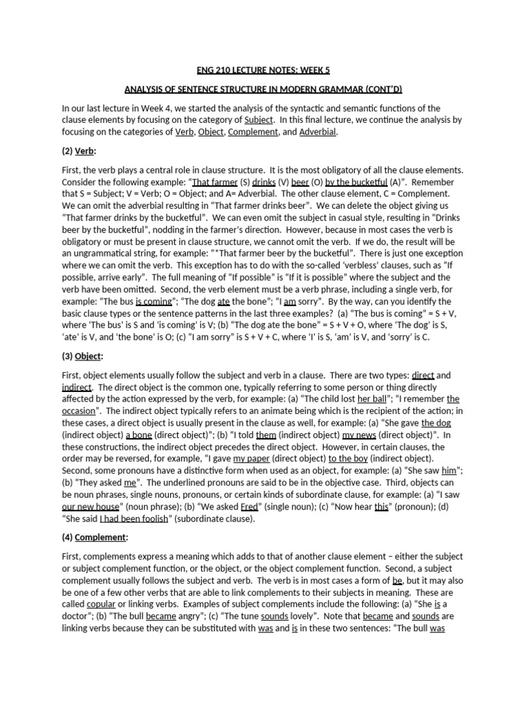 clause elements by focusing on the category of Subject. In this final lecture, we continue the analysis by