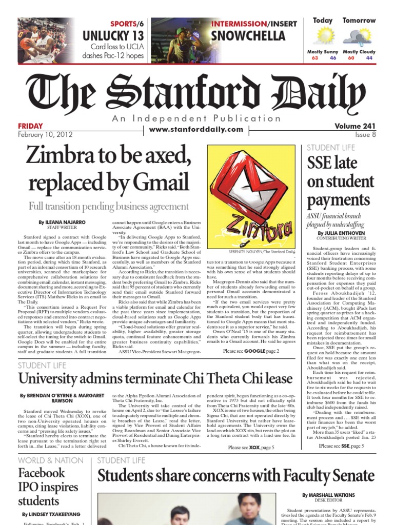 Stanford signed a contract with Google last month to have Google Apps including Gmail replace the communication services Zimbra offers to the campus. The move came after an 18-month evaluation period, during which time Stanford, as part of an informal consortium of 10 research universities, scanned the marketplace for comprehensive collaboration solutions for combining email, calendar, instant messaging, document sharing and more, according to Executive Director of Information Technology Services (ITS) Matthew Ricks in an email to The Daily. This consortium issued a Request For Proposal (RFP) to multiple vendors, evaluated responses and entered into contract negotiations with selected vendors, Ricks wrote. The transition will begin during spring quarter, allowing undergraduate students to self-select the timing for the switch to Gmail. Google Docs will be enabled for the entire campus in the summer including faculty, staff and graduate students. A full transition