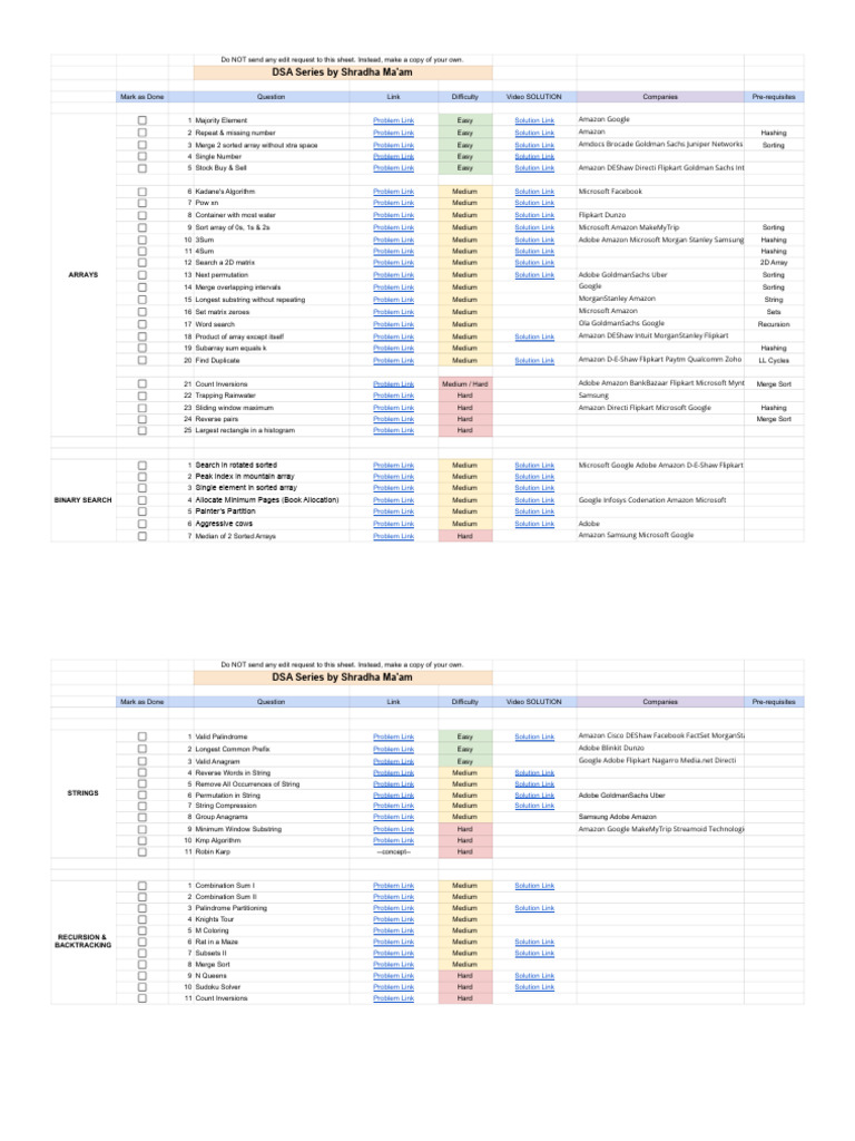 Mark as Done Question Link Difficulty Video SOLUTION Companies Pre-requisites
