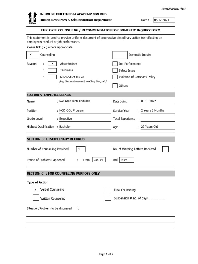 EMPLOYEE COUNSELING / RECOMMENDATION FOR DOMESTIC INQUIRY FORM