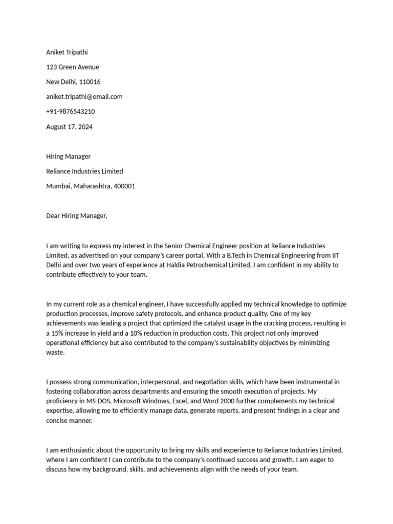 I am writing to express my interest in the Senior Chemical Engineer position at Reliance Industries