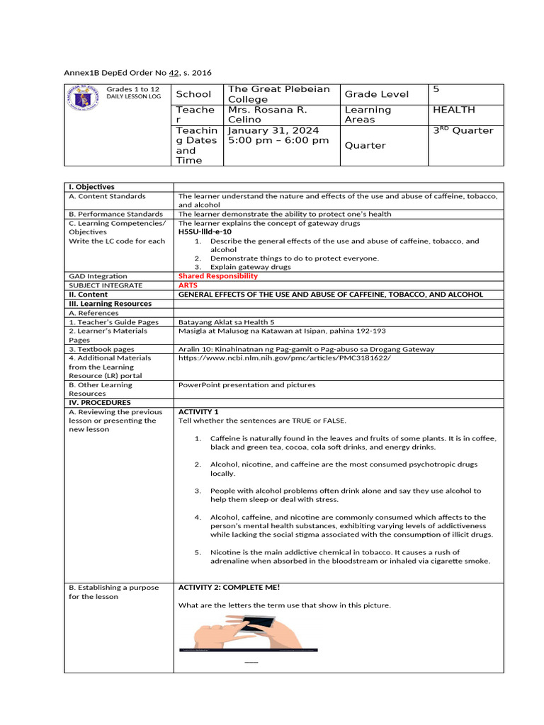 A. Content Standards The learner understand the nature and effects of the use and abuse of caffeine, tobacco,