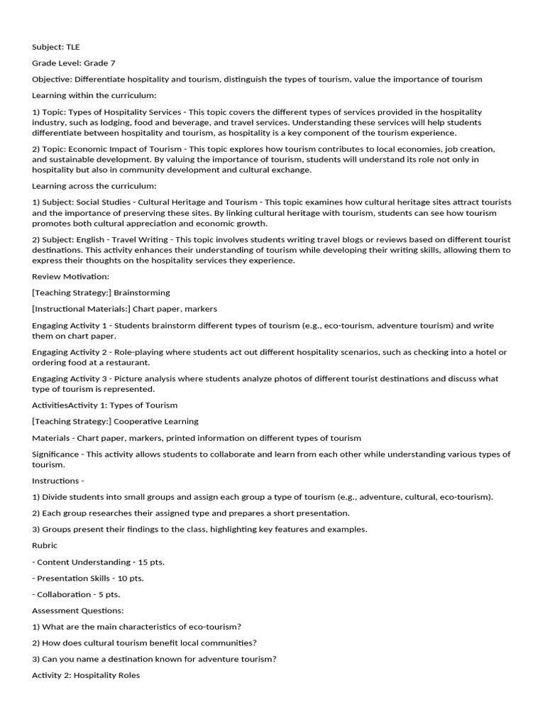 and sustainable development. By valuing the importance of tourism, students will understand its role not only in