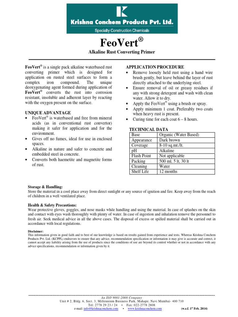 FeoVert® is a single pack alkaline waterbased rust APPLICATION PROCEDURE
