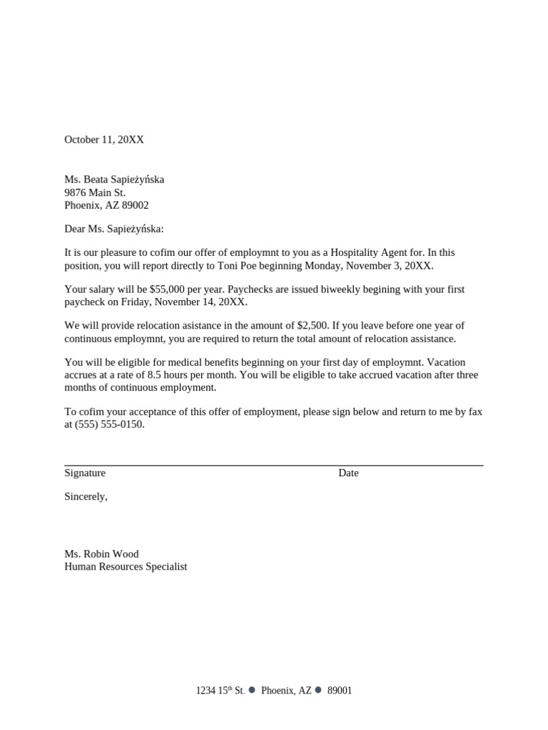 To cofim your acceptance of this offer of employment, please sign below and return to me by fax