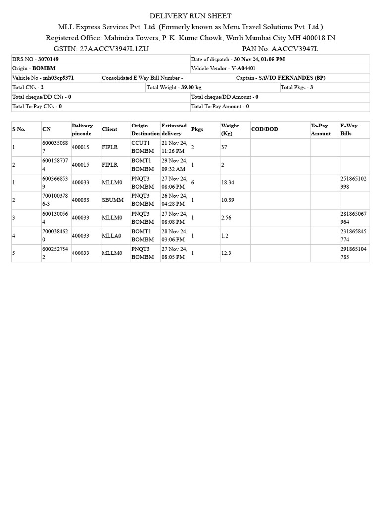 Vehicle No - mh03cp5371 Consolidated E Way Bill Number - Captain - SAVIO FERNANDES (BP)