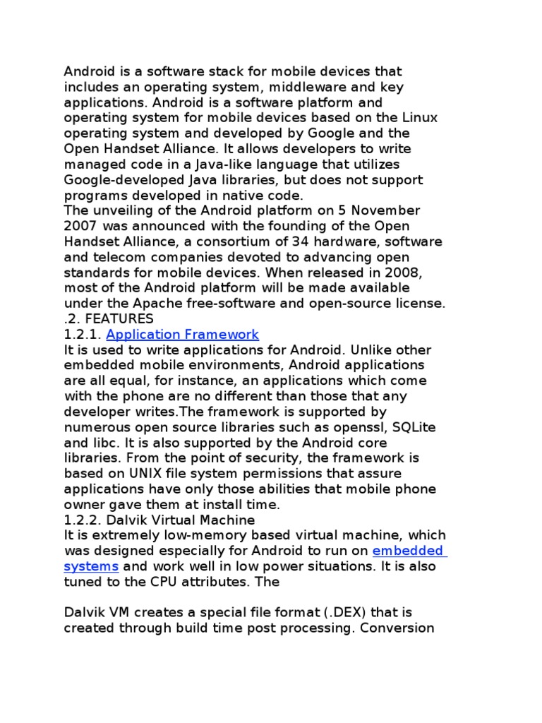Android is a software platform and operating system for mobile devices based on the Linux operating system and developed by Google and the Open Handset Alliance. It allows developers to write managed code in a Java-like language that utilizes Google-developed Java libraries, but does not support programs developed in native code. The unveiling of the Android platform on 5 November 2007 was announced with the founding of the Open Handset Alliance, a consortium of 34 hardware, software and telecom companies devoted to advancing open standards for mobile devices. When released in 2008, most of the Android platform will be made available under the Apache free-software and open-source license. .2. FEATURES 1.2.1. Application Framework It is used to write applications for Android. Unlike other embedded mobile environments, Android applications are all equal, for instance, an applications which come with the phone are no different than those that any developer writes.The framework is supported by numerous open source libraries such as openssl, SQLite and libc. It is also supported by the Android core libraries. From the point of security, the framework is based on UNIX file system permissions that assure applications have only those abilities that mobile phone owner gave them at install time. 1.2.2. Dalvik Virtual Machine It is extremely low-memory based virtual machine, which was designed especially for Android to run on embedded systems and work well in low power situations. It is also tuned to the CPU attributes. The Dalvik VM creates a special file format (.DEX) that is created through build time post processing. Conversion