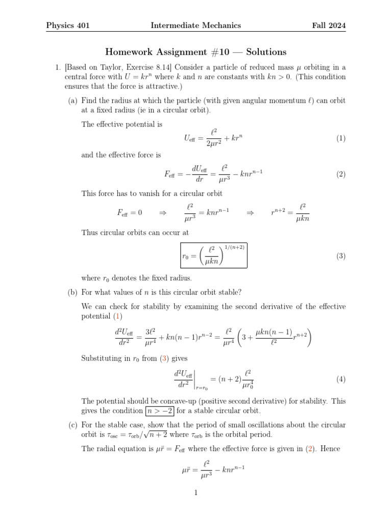 1. [Based on Taylor, Exercise 8.14] Consider a particle of reduced mass µ orbiting in a
