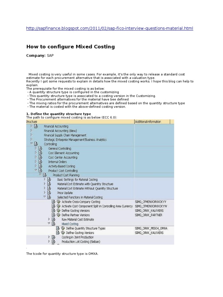 Mixed costing is very useful in some cases. For example, it's the only way to release a standard cost estimate for each procurement alternative that is associated with a valuation type. Recently I got some requests to explain in details how the mixed costing works. I hope this blog can help to explain. The prerequisite for the mixed costing is as below: - A quantity structure type is configured in the customizing - This quantity structure type is associated to a costing version in the Customizing. - The Procurement alternatives for the material have bee defined - The mixing ratios for the procurement alternatives are defined based on the quantity structure type - The material is costed with the above-defined costing version. 1. Define the quantity structure type The path to configure mixed costing is as below (ECC 6.0):