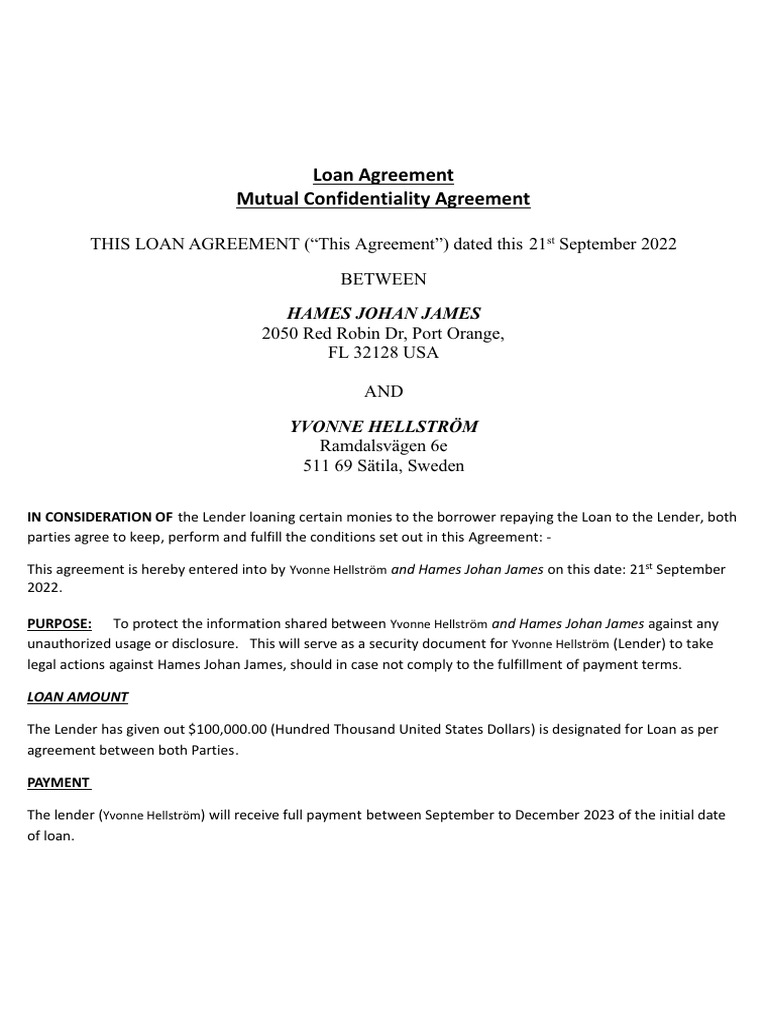 This agreement is hereby entered into by Yvonne Hellström and Hames Johan James on this date: 21st September