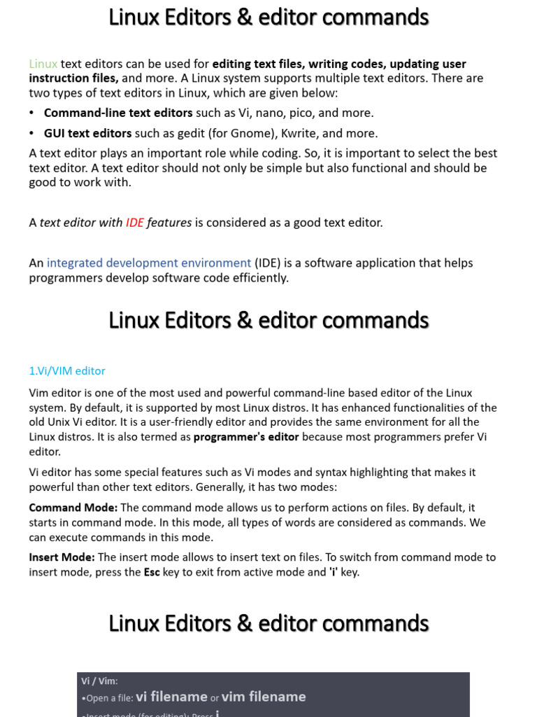instruction files, and more. A Linux system supports multiple text editors. There are
