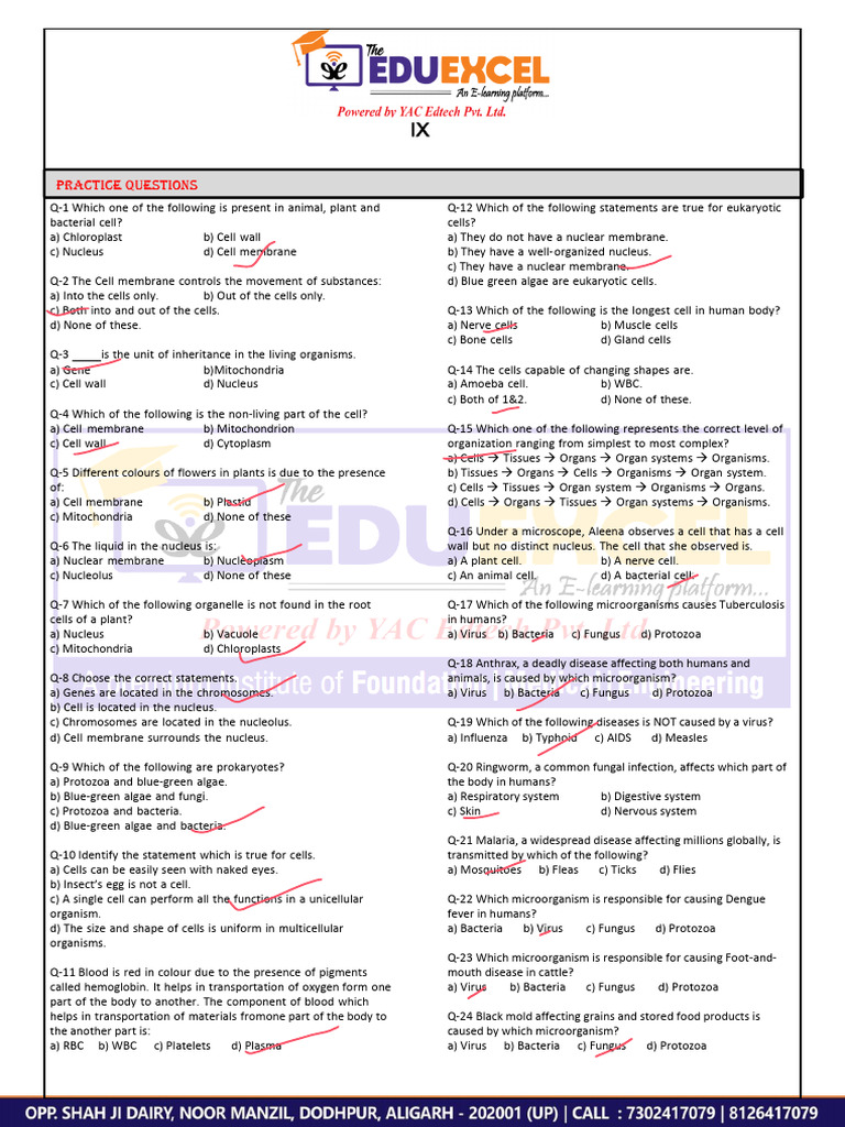 a) RBC b) WBC c) Platelets d) Plasma a) Virus b) Bacteria c) Fungus d) Protozoa