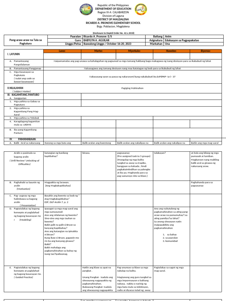 Pang-araw-araw na Tala sa Guro BABYLYN A. AGUILAR Asignatura Edukasyon sa Pagpapakatao