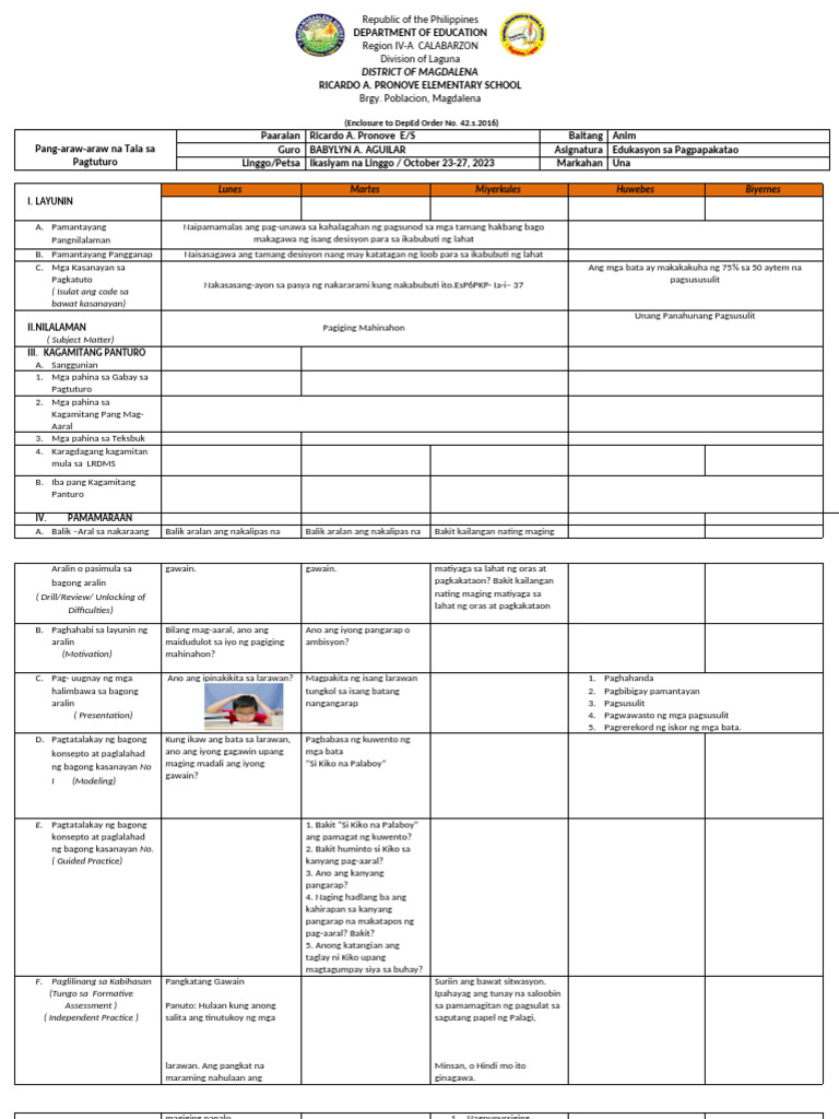 Pang-araw-araw na Tala sa Guro BABYLYN A. AGUILAR Asignatura Edukasyon sa Pagpapakatao